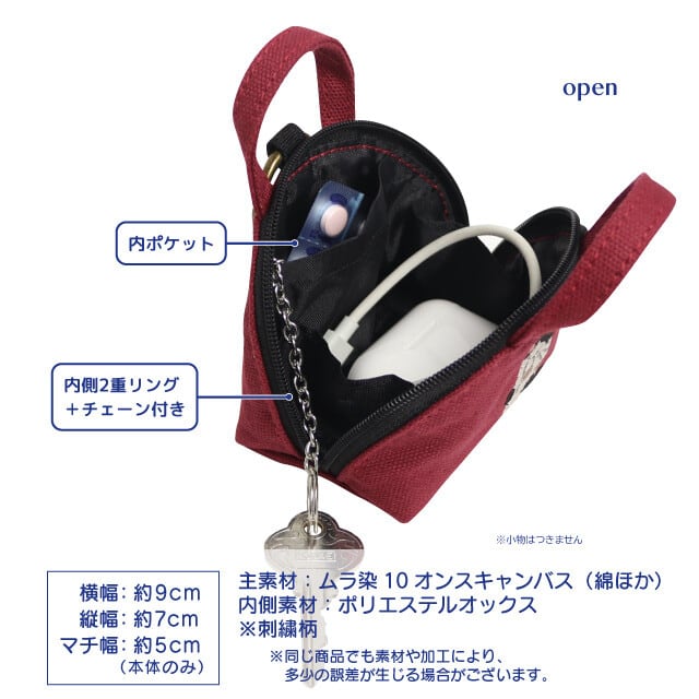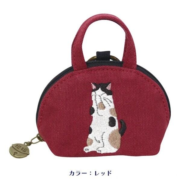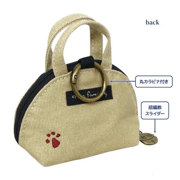 ミニバッグ型のカラビナ付きキーポーチです。おねがいねこの刺繍や招福チャームがかわいいです。